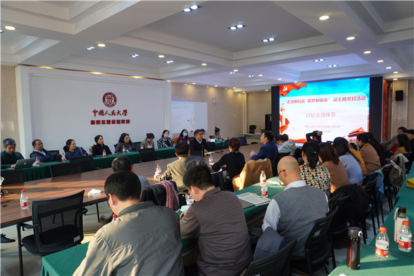 王甫银首先带领各位党员认真学习了习近平总书记关于京津冀协同发展、副中心建设的重要论述,重温了习近平总书记致中国人民大学建校80周年的贺信,并详细介绍了北京城市副中心建设进展、新校区周边区域规划建设情况、新校区规划建设最新进展和下一步工作计划。