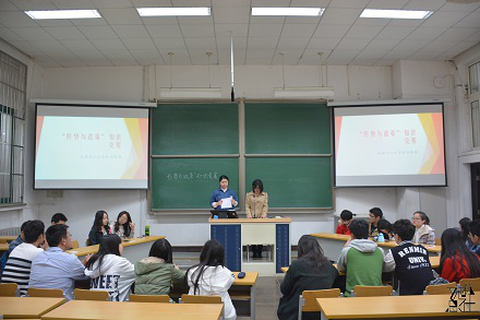 接下来的“你画我猜”环节则充分地将“形势与政策”的知识性和竞技的趣味性结合在一起。本环节共五组题目,每组题目都是“形势与政策”关键词的任意组合,每个参赛小组选出两名选手,一人描述,一人猜词进行作答。这种比赛形式既考察了选手们对“形势与政策”知识的掌握程度,又检验了小组成员之间的默契和配合程度,对选手们的综合素质要求极高。本轮比赛中,2014级本科生王菲和2015级本科生隋本晖表现突出,使其小组在本轮中的处于领先。
