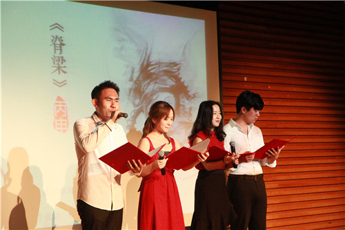 本科2015级社会班团支部首先登台为大家带来诗歌朗诵《人生》。动情的朗诵中传达的是那即使面临着艰难险阻也要勇往直前、披荆斩棘的勇气,更是对未来的憧憬与希望。接下来是2015级人口班团支部带来的《致大海》,朗诵中我们所听到的大海不是完美的化身,而是变幻的生活,是对真实的生活细腻的观察。大海有涨有落,有风暴,有平静;它多变,并不完美,但它真实。接下来是2015级社工班团支部带来的《脊梁》,激昂慷慨的声音传达的不仅是对祖国的歌颂,更是对华夏民族、中国千万人民的歌颂,是对身为中华儿女巨大的自豪感。透过诗歌我们看到了近代以来中国遭受的耻辱,中华民族用他的脊梁默默承担着这些痛苦,在压抑中艰难成长。我们更能看见,中华民族正挺直脊梁,大踏步地走向远方。