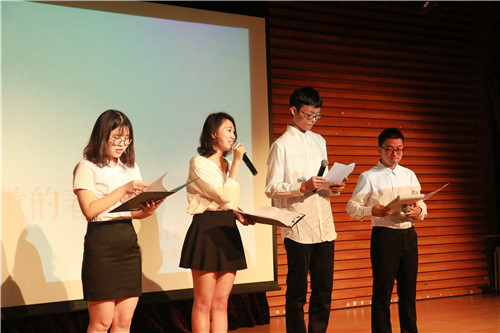 首先,由唐颖老师致辞:“在学生活动丰富多彩的校园里,我们的主题诗歌朗诵会坚持了十一年。因为, 诗歌是最古老、最基本的文学形式,语言凝练,节奏鲜明,富于音乐美。当我们通过语言、体态把文学作品化为有声的语言,这种创作本身就体现了所思所想。今年是改革开放40周年,马上我们还将迎来党的生日。今天我们在这里寄情于诗,言诗咏志,希望同学们继承传统,珍惜现在,放眼未来。”