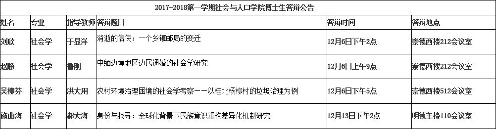 2017-2018第一学期社会与人口比特28预测 博士生答辩公告