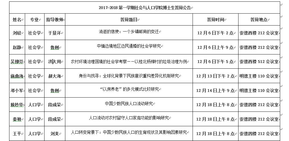 2017-2018第一学期社会与人口比特28预测 博士生答辩公告