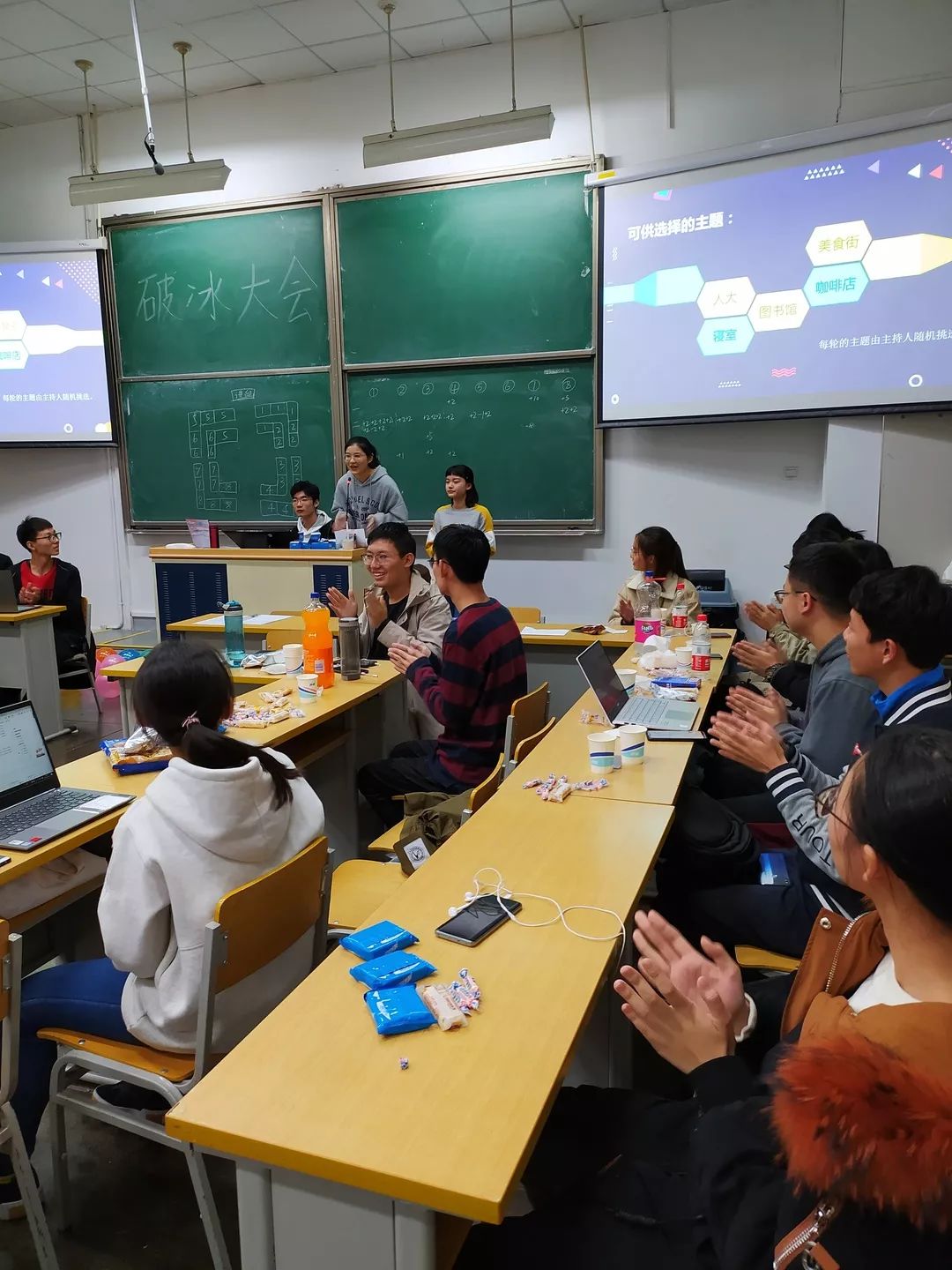 工作人员早早抵达现场进行布场等一系列活动准备,参加活动的同学们也陆续来到教室进行签到并且通过抽签分组就坐。在大家的期待中,“破冰”活动正式开始。