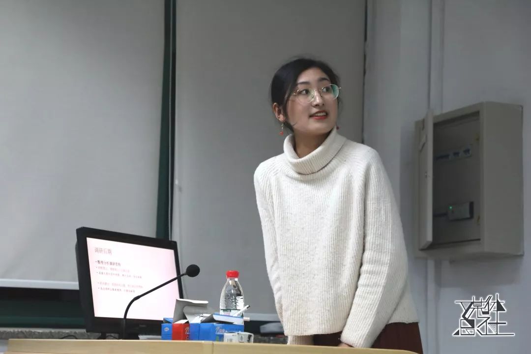 随后闫晓丹发言。她首先介绍了她的科研经历,又从选题、可视化程度和理论运用的适切性三个角度进一步说明了怎样使小创作品更具有吸引力和竞争力。她还在最后给出了几点小提示,希望同学们认真选择研究方法并处理好团队关系。