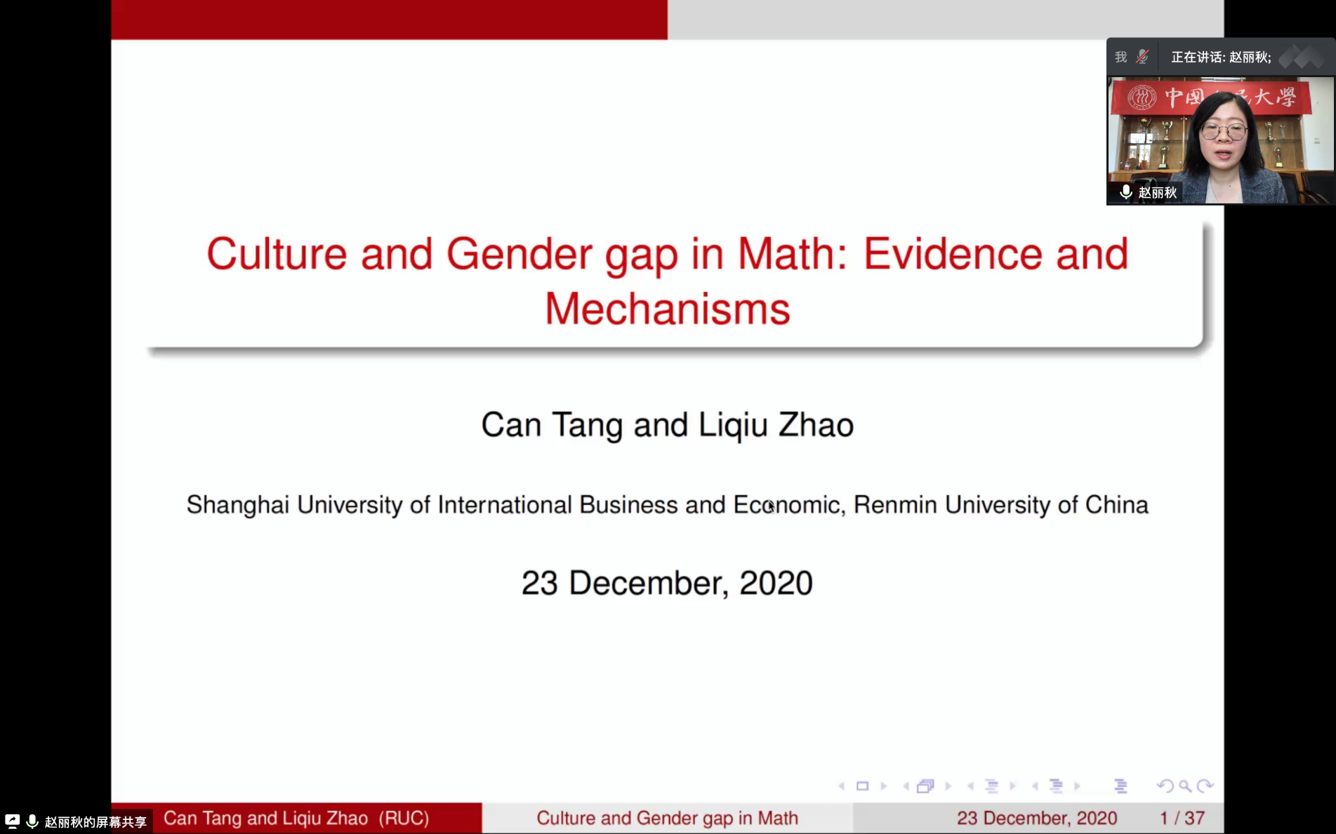 2020-12-28 文:比特28预测 图:比特28预测2020年12月23日中午12点,人口学系刘铮系列学术讲座暨严肃的人口学八卦青年沙龙成功举办。中国人民大学劳动人事比特28预测 副教授赵丽秋在腾讯会议,以“Culture and Gender Gap in Math: Evidence and Mechanisms”为主题做了一场线上学术讲座。中国人民大学社会与人口比特28预测 副教授吕利丹主持了本次活动,中国人民大学社会人口比特28预测 及其他国内外院校相关专业的80余名师生听取了报告并进行交流学习。
