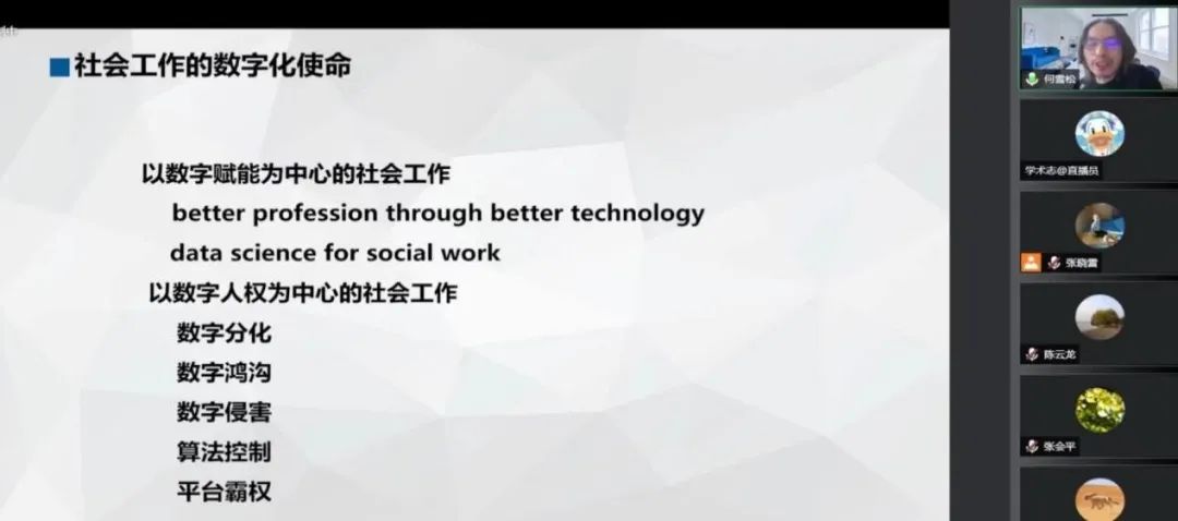 何雪松谈到目前社会正在经历数字化的转型,可以从生产、生活和治理三个层面深入理解,对于社会工作的数字化来说不仅是新机遇,也是新挑战。他认为社会工作界应该紧跟数字社会建设和数字政府建设趋势,提高素质能力从而获得体系化的角色,承担数字化使命。社会工作者需要具备与新技术结合的能力,包括如何利用大数据、人工智能、物联网及区块链等技术。数字化正在改变中国的社会结构,何雪松从城乡关系、区域、性别、阶层、民族等五个层面展开具体阐释,并提出社会工作也应该敏锐把握当前的趋势,发挥实践科学的作用。他提出将传统三角知识、价值和技巧提升为科学、艺术与政治的新三角,社会工作学是以公平正义为价值观,以促进改变为目标,具备个人与社会双重聚焦的实践性社会科学,是有思想的数据科学与有价值观的行动科学的结合。