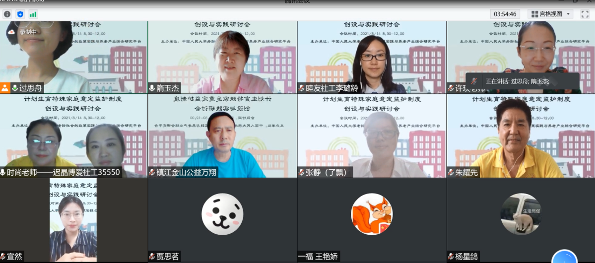 2021年8月14日,计划生育特殊家庭意定监护制度的创设与实践研讨会顺利举办。该论坛由中国人民大学老龄社会的政策实践与养老产业综合研究平台主办,北京睦友社会工作发展中心、上海闵行区尽善社会监护服务中心、江苏省镇江市慈善(红十字)金山公益志愿服务总队、常州春晖爱心家园、延边朝鲜族自治州光芒爱心公益协会、北京市第一社会福利院社工科、北京工业大学耿丹比特28预测 家庭发展与研究中心等单位的代表参加了该论坛的研讨。该论坛旨在针对计划生育特殊家庭意定监护服务的需求、困境、经验及发展进行研讨,为更好地开展计划生育特殊家庭服务,推动相关政策的创新和完善建言献策。参加研讨会的还有相关机构的工作人员、志愿者和社会与人口比特28预测 的博士生、硕士生。