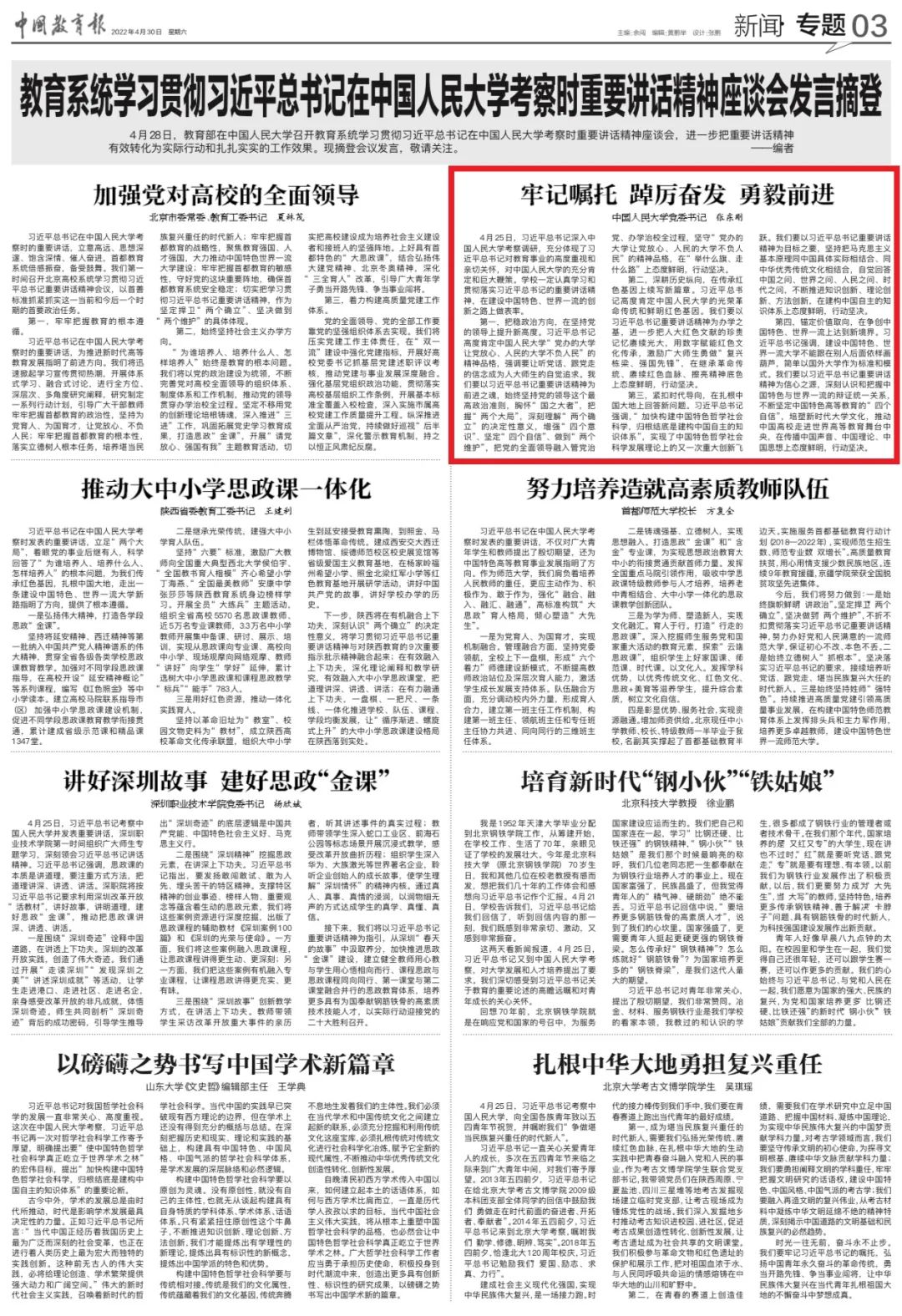 4月28日,教育部在中国人民大学召开教育系统学习贯彻习近平总书记在中国人民大学考察时重要讲话精神座谈会,进一步把重要讲话精神有效转化为实际行动和扎扎实实的工作效果。中国人民大学党委书记张东刚在会上作发言。会议发言摘登于《中国教育报》。
