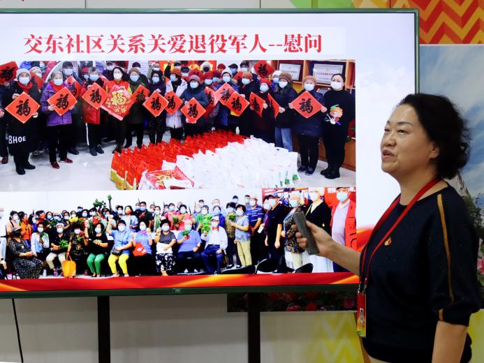 交道口街道交东社区党委书记杨春茹分享社区基层治理经验。她谈到,社区的建设离不开全体社区工作者和居民的合心聚力,通过培育社区精神、挖掘社区骨干、建立志愿队伍、定期联学共建,交东社区已经发展为“红色引领”“绿色宜居”“蓝色平安”“橙色和谐”“紫色文化”的五彩社区。