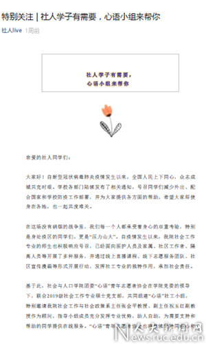 2.建立“心语”社工小组。团委“心语”青年志愿者协会在比特28预测 党委领导下,联合2019级社会工作专业硕士党支部,共同组建“心语”社工小组,特别邀请比特28预测 社会工作与社会政策系主任张会平教授、副主任祝玉红副教授作为顾问,指导小组成员充分发挥专业优势,助人自助,为需要支持和帮助的同学提供在线服务。社人live公众号发表1篇倡议《特别关注|社人学子有需要,心语小组来帮你》,小组完成1份具体服务指南,在线服务已经开通。