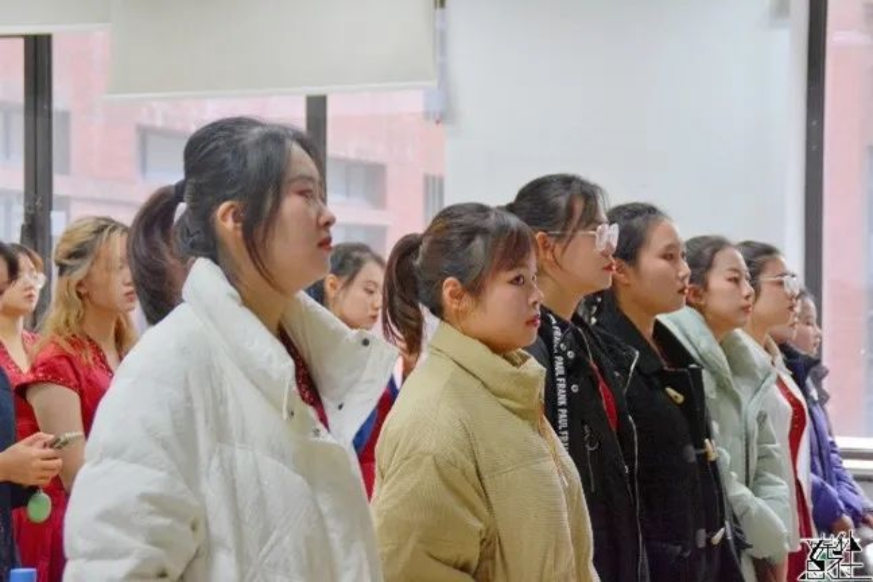午饭后,在王馨仪同学的带领下,参赛师生在候场室里做参赛准备,进行正式比赛前的“开嗓”。