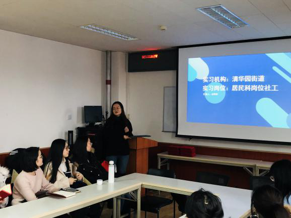 总结会一开始,十二位优秀实习生代表结合自身实习经历进行了精彩分享。他们的实习机构类型多样,既有街道和社会组织,也有行业协会和基金会,服务对象和服务领域涉猎广泛。通过四个月的专业实习,同学们不仅对本土社会工作发展现状和前景有了切身体会,而且在实践中提升了理论、方法和伦理的整合能力。四个月的磨练让同学们重新认识了社会工作的专业性,并收获了自我成长。