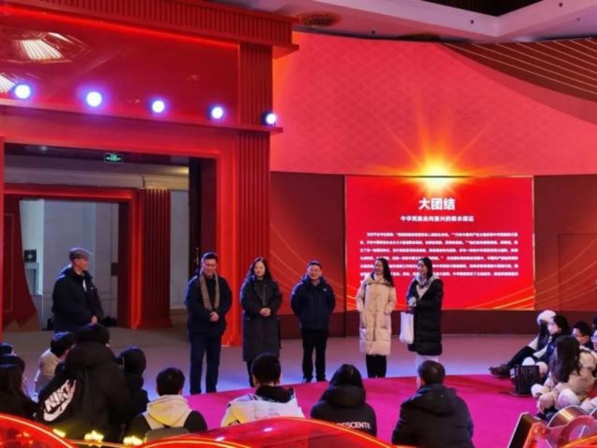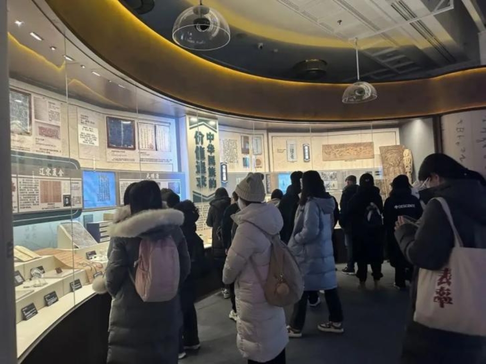 上午九点,两院师生抵达民族文化宫“铸牢中华民族共同体意识文物古籍展”展厅,共同开启了一段穿越古今的文化之旅。本次展览以铸牢中华民族共同体意识为主线,深刻把握中华文明的突出特性,深入挖掘各民族交往交流交融的史实,生动呈现了中华民族共同体形成发展历史。