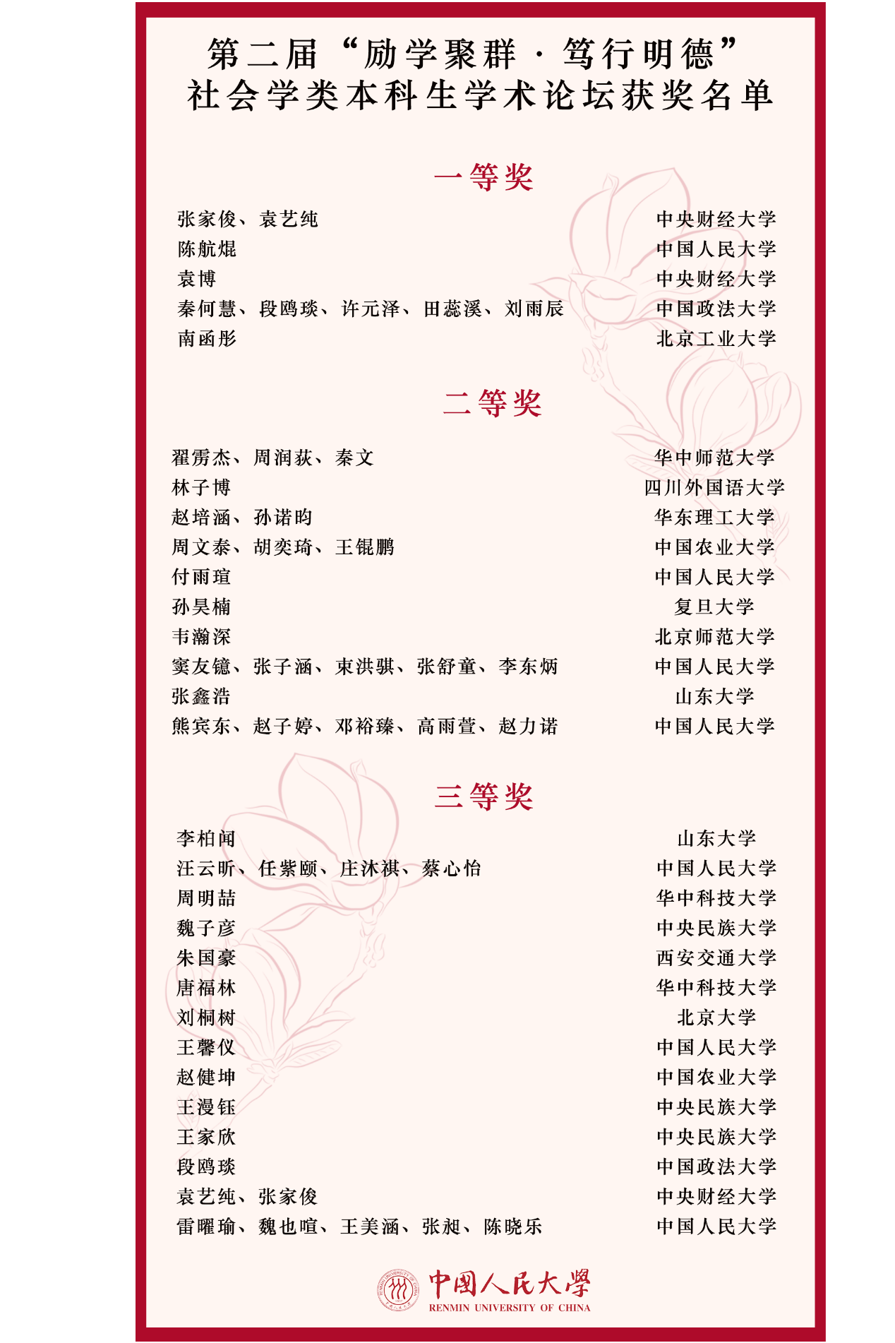 习近平总书记在中国人民大学考察时强调,希望广大青年用脚步丈量祖国大地、用眼睛发现中国精神、用耳朵倾听人民呼声、用内心感应时代脉搏,把对祖国血浓于水、与人民同呼吸共命运的情感贯穿学业全过程、融汇在事业追求中。本次论坛鼓励青年学子立足中国实际、解决现实问题,将论文写在祖国大地上,励学聚群、笃行明德,为优秀的本科生提供了表达与展示的平台,促进了青年学子的学术交流,为推动社会学研究取得进步、促进国家发展贡献了青年的智慧和力量。