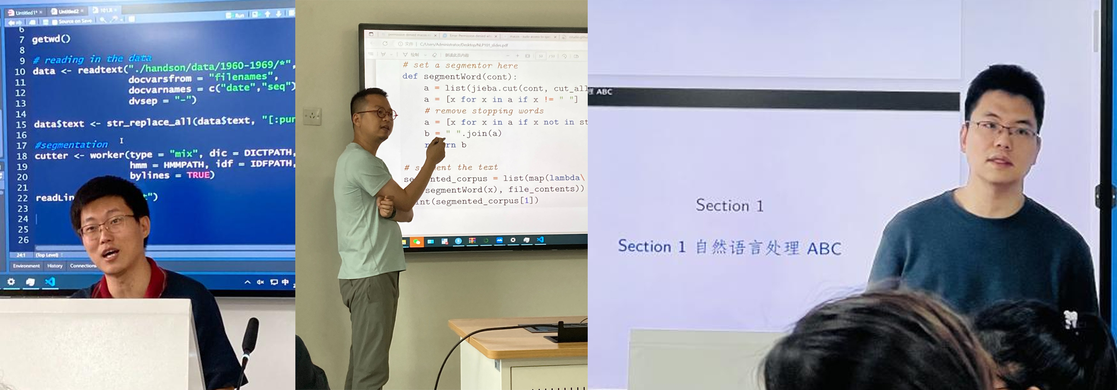 中国政法大学社会学系副教授李代、加州大学圣迭戈分校社会学系博士候选人张博伦、中国人民大学社会学系讲师周浥莽介绍了自然语言处理的基础知识,让学员们初步了解计算社会科学领域核心技术的基本内涵和应用。主讲人也帮助学员布置R和python的编程环境。