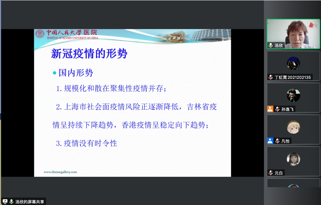 随后,汤欣副院长介绍了当前新冠奥密克戎变异株的传播特性、疫情的国际与国内形势。她指出,虽然当前奥密克戎毒株重症感染率下降,但发生“免疫逃逸”的可能性依旧很大,接种疫苗加强针仍是降低重症率发生的有效手段。接下来,汤院长着重分析了北京市近期疫情状况,她认为,北京市疫情目前总体可控,新增病例大部分是从管控人群中筛出。汤欣副院长还还积极评价了北京市防控政策,认为北京市坚持“动态清零”总方针,通过多轮核酸检测深挖传染源,切断传播途径,保护易感人群,以实现社会面清零,达到“及时发现、快速处置、精准管控、有效救治”总目标,筑牢疫情防控屏障。